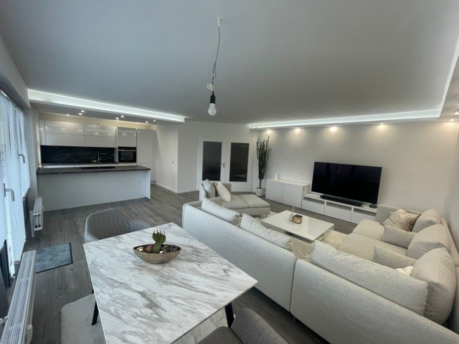 Der Wohnbereich zeichnet sich durch seine offene Gestaltung aus, die ein großzügiges Raumgefühl schafft. Der hochwertige Boden aus Vinyl und Fliesen unterstreicht den modernen Stil und sorgt zugleich für Langlebigkeit und Pflegeleichtigkeit. Die Einbauküche im Wert von 5.000 EUR kann gegen Aufpreis übernommen werden und fügt sich harmonisch in die offene Wohnlandschaft ein.
